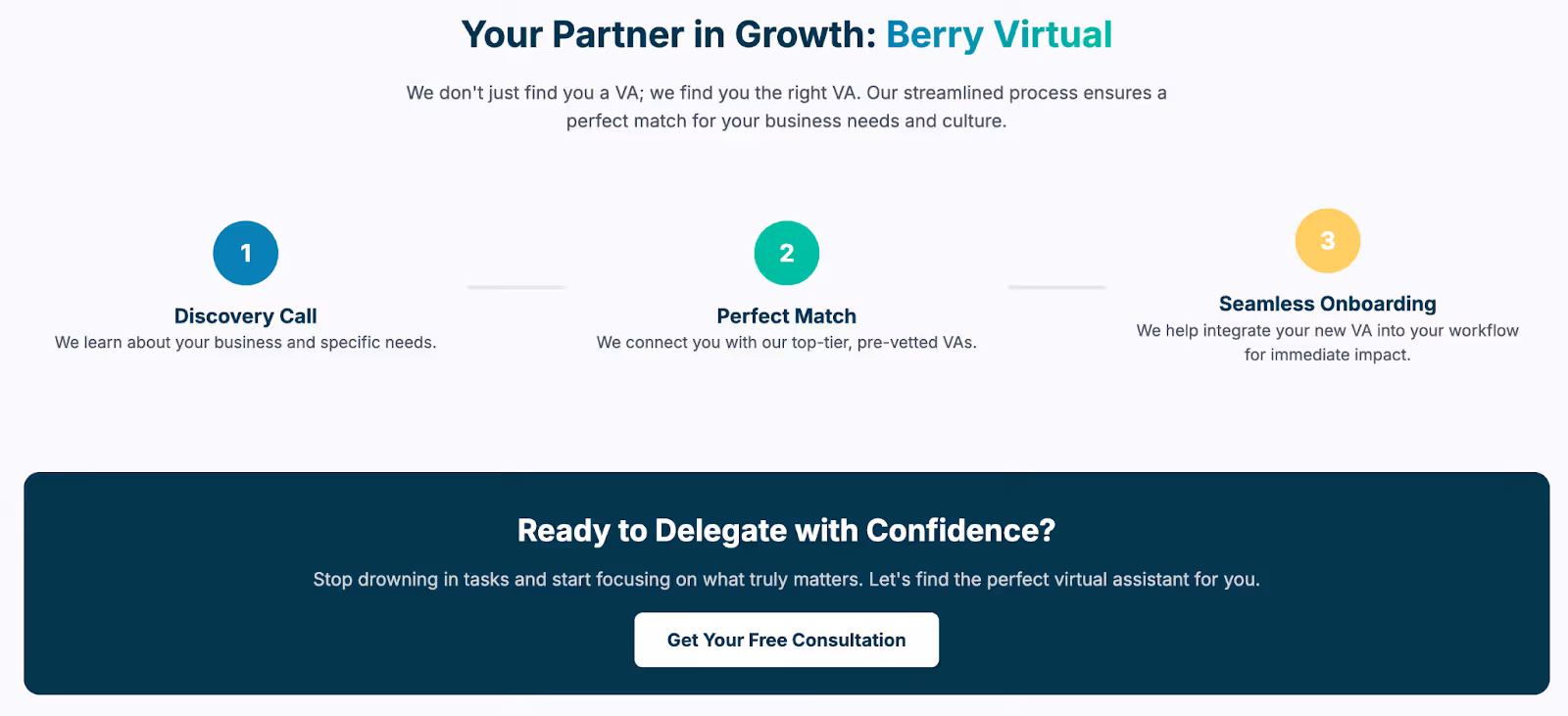 At Berry Virtual, we make the process of finding your perfect assistant simple and stress-free. Our personalized matching process ensures that you're paired with a professional who not only has the right skills but also fits your company culture.
